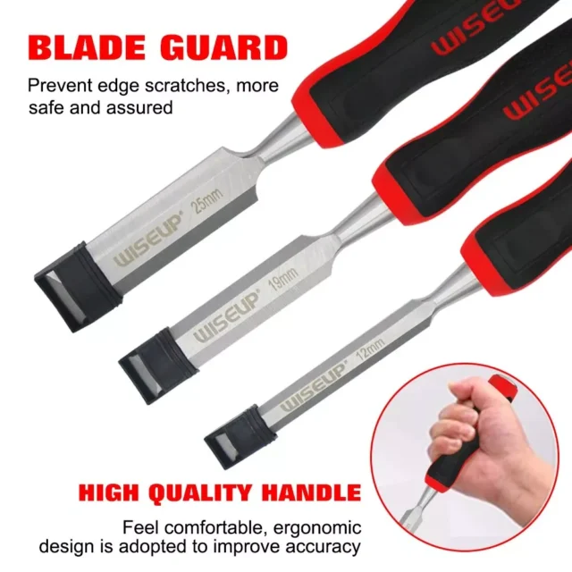 Our chisel set stands out for its quality and thoughtful design. The fully-forged Cr-V steel blades are not only robust but also maintain their sharpness, allowing you to work with various wood types, including softwood, hardwood, and laminated wood. The comfortable handles provide a secure grip, giving you complete control over your carving, whether you’re working on dovetail joints or creating intricate patterns.