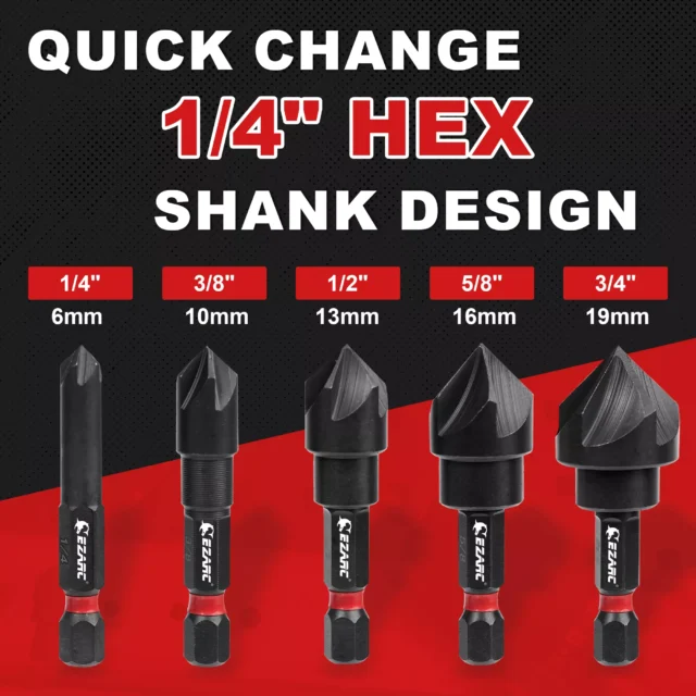 This set includes five different sizes of countersink drill bits: 1/4”, 3/8”, 1/2”, 5/8”, and 3/4”. This range of sizes allows you to tackle a wide variety of projects, from small detailed work to larger industrial tasks. The 1/4 inch hex shank ensures compatibility with most power drills, making it easy to switch between bits as needed.
