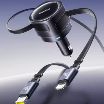 90W Dual USB Car Charger with Retractable Cable for iPhone and Tablets