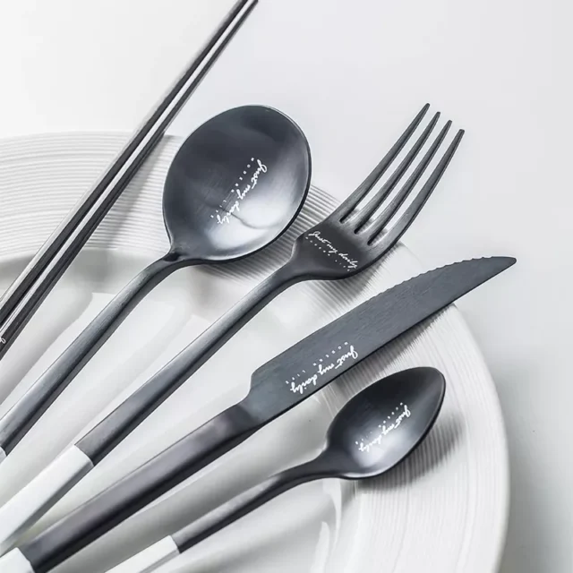 This cutlery set stands out due to its combination of elegant design, high-quality materials, and functional features. The black and white color scheme with printed letters adds a unique and stylish touch, while the 304 stainless steel construction ensures long-lasting durability. The inclusion of chopsticks in the set provides an extra element of versatility, catering to various dining preferences.