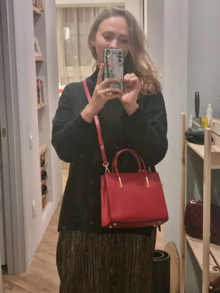 Buying this bag was one of the best decisions I've made fashion-wise. The leather is rich in color and feels soft to the touch. The bag’s design is both elegant and practical, offering ample space without being cumbersome. The metal knot handle is a beautiful feature that elevates the bag's overall aesthetic. It’s perfect for various occasions, from daily outings to more formal events. The attention to detail is remarkable, and it’s clear that this bag was made with both style and function in mind. Carrying this bag has enhanced my outfits and given me a boost of confidence in my style