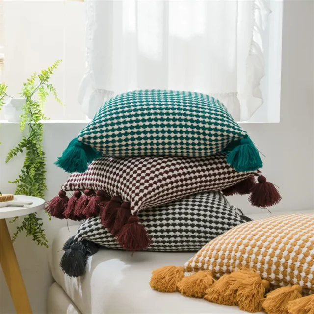 Crafted from high-quality acrylic fabric, this cushion cover is both durable and soft to the touch. The knitted design ensures a luxurious texture, while the plaid pattern and tassels add a playful yet sophisticated flair. Measuring 18 x 18 inches, it fits standard cushion inserts of 18 x 18 or 20 x 20 inches, making it versatile for different pillow sizes.