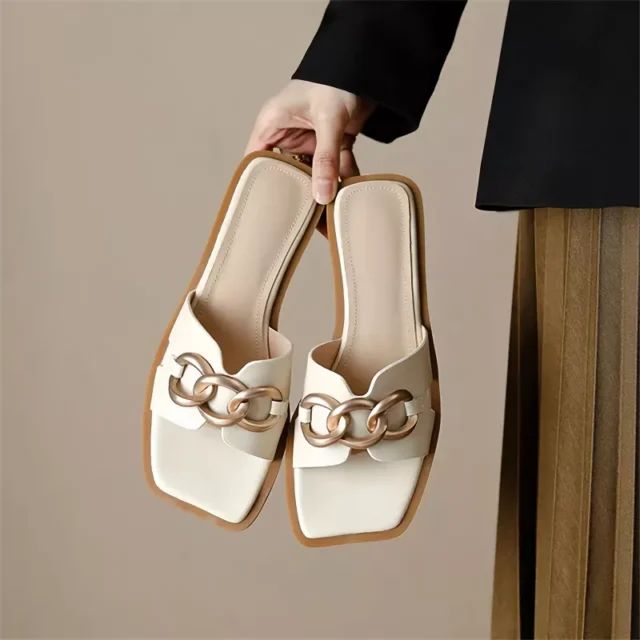 • Unique Design: Featuring a distinctive square toe and elegant metal decoration, these slippers are the epitome of modern style.