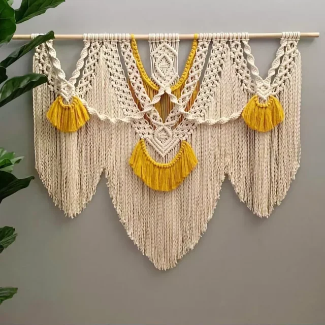Elevate your living room or bedroom with our stunning Yellow Large Macrame Wall Hanging Tapestry. Handwoven with love and crafted from 100% high-quality cotton rope, this eye-catching tapestry combines creamy-white and yellow hues to bring warmth and vibrancy to any room. Perfect for creating a cozy atmosphere or as a striking background decoration, this tapestry effortlessly blends into both modern and traditional home decor.